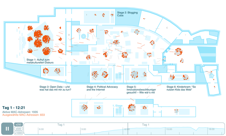 Kreil tested this out with his project, Re:log, based on anonymized location data he received from Re:publica conference goers who had hooked into, and used the conference’s Wi-Fi system. This data showed the different rooms and stages where people had logged-in, from which Kreil created a visualization of this usage with a floorplan of the conference venue and dots to indicate users. The most important thing for Kreil in publishing this project was to “make people think about surveillance.” While there are a lot of progressive, interesting, and harmless ways to connect people together using this data (similar interests, goals, work focus), there is also the chance that this information could be used to do harm (privacy invasion, stalking). Harm may not always be the intention, however it is important to be aware of the possibility, so users can take appropriate measures to protect themselves, depending on the level of comfort they have with the information being shared.